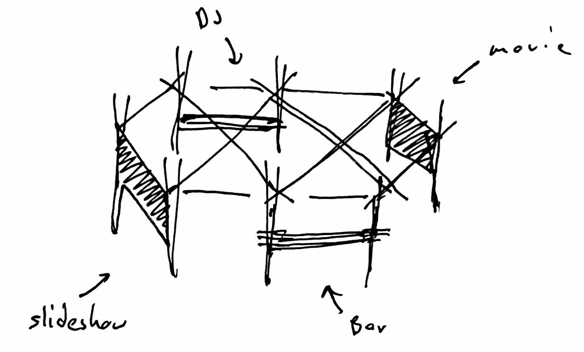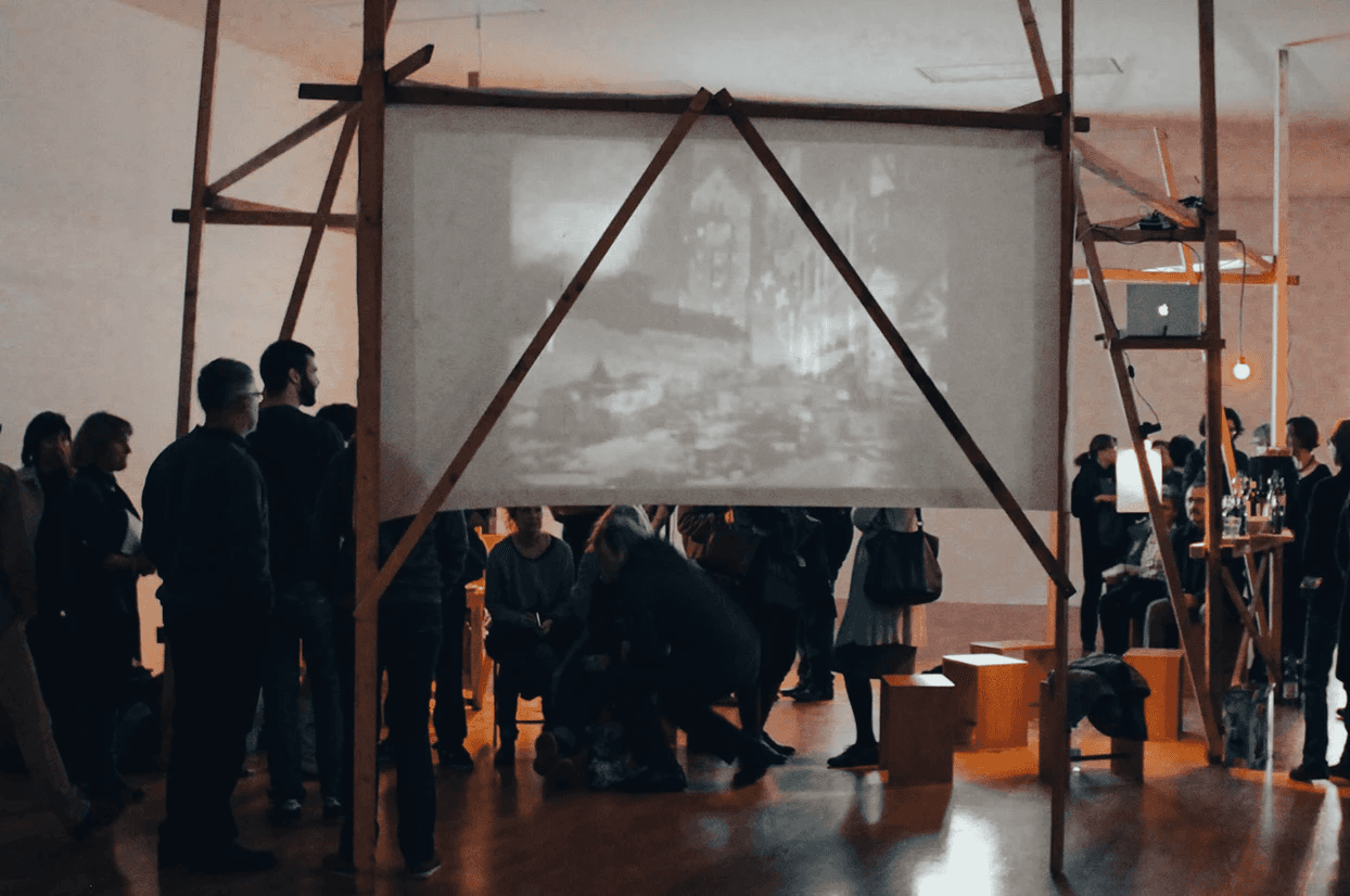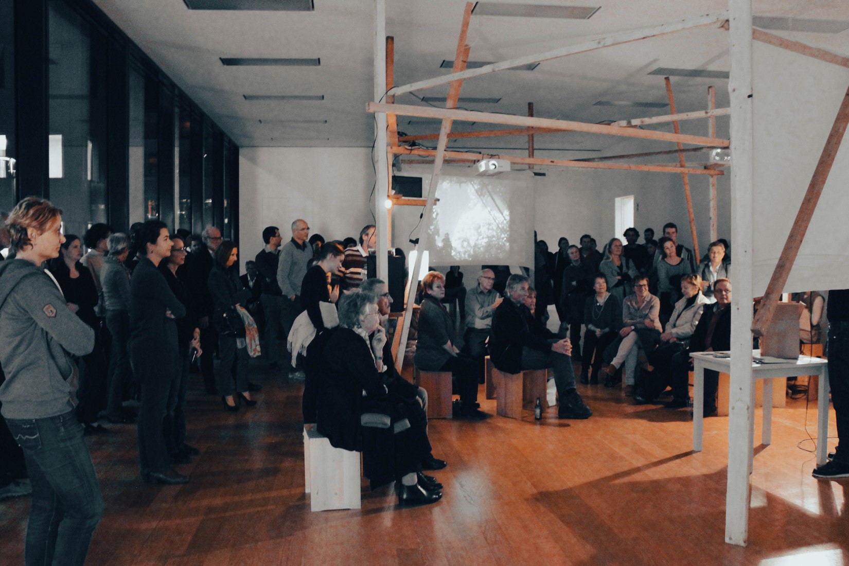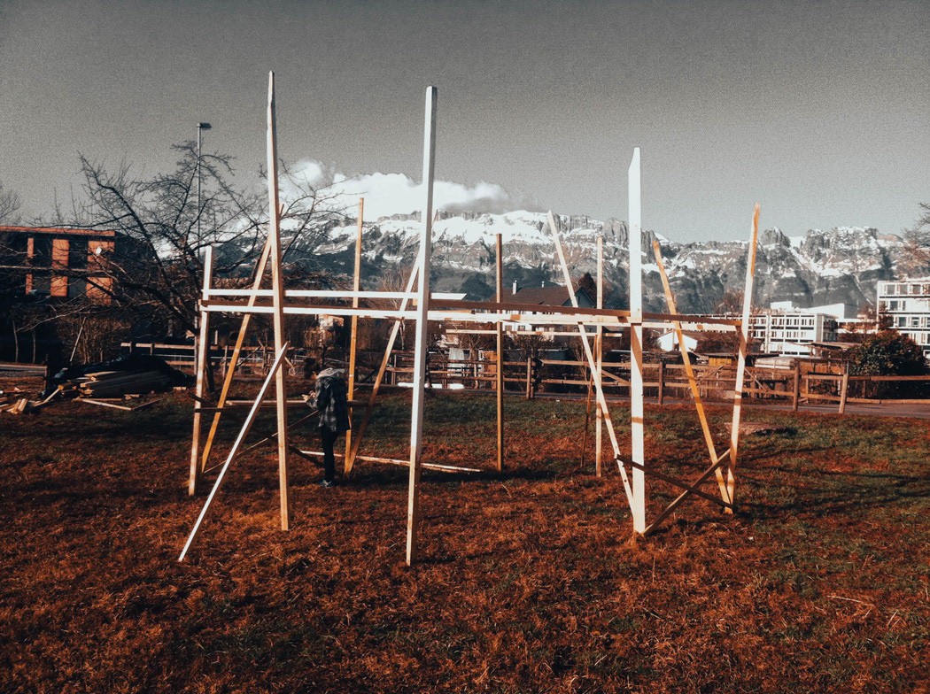 Die Künstlerin Anna Hilti erhielt vom Kunstmuseum Liechtenstein eine Carte Blanche und lud Luis Hilti ein, eine Struktur beizutragen, die im Verlauf des Abends als Kino, Bar und Tanzfläche funktionieren sollte.