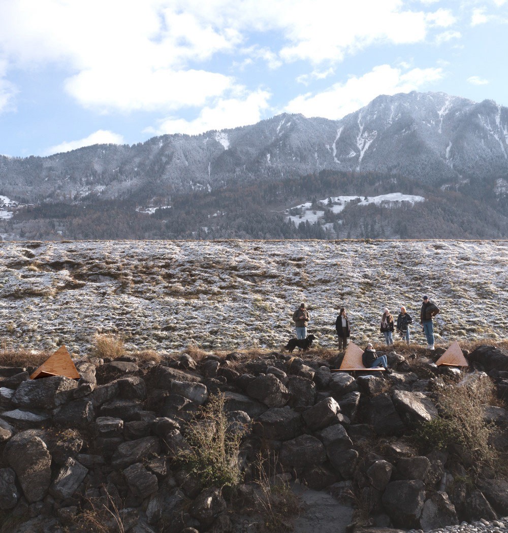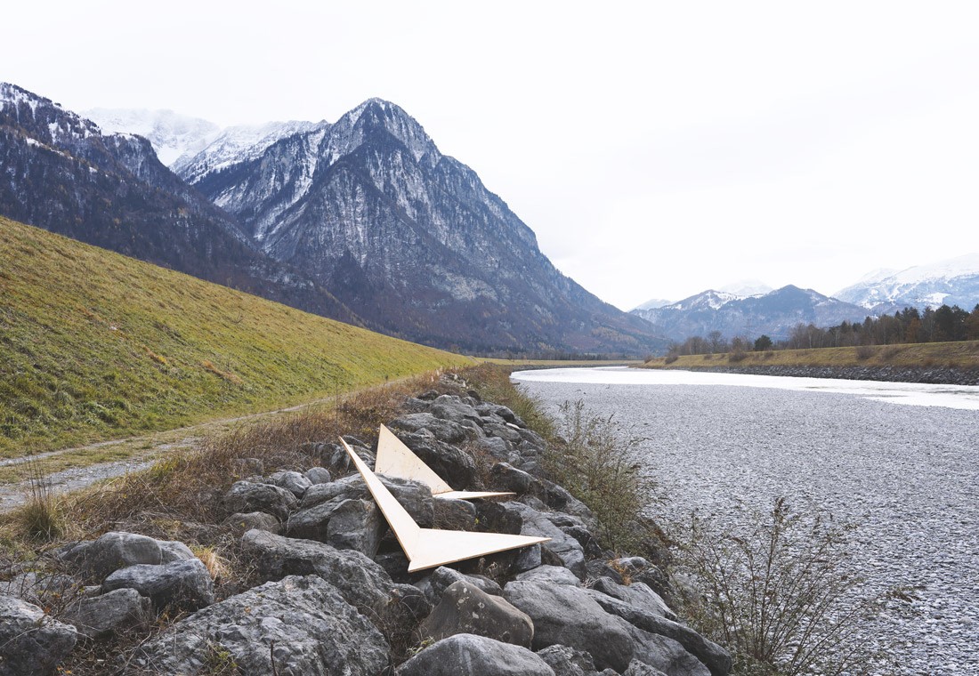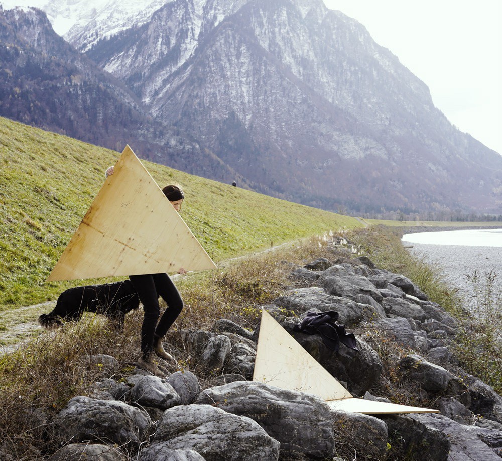 s*dreieckle (das Dreieck) wurde aus wiederverwendeten Holzplatten hergestellt, die 2015 Teil eines Kunstwerks im Kunstmuseum Liechtenstein waren. Sie dienten dann im Atelier als Tisch, Regal und andere Möbel.