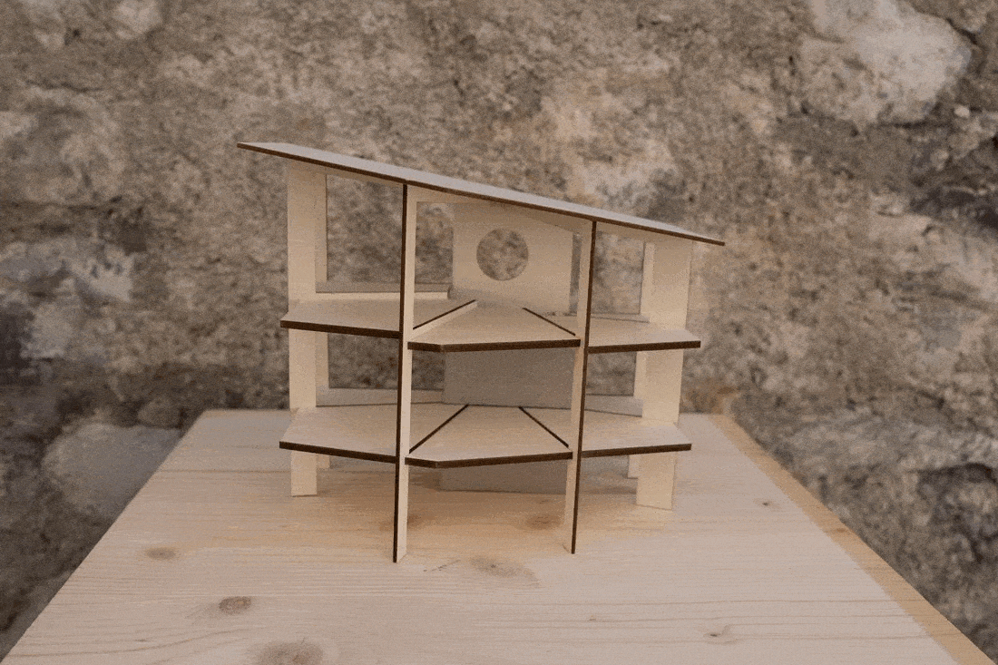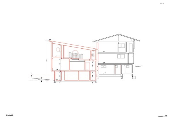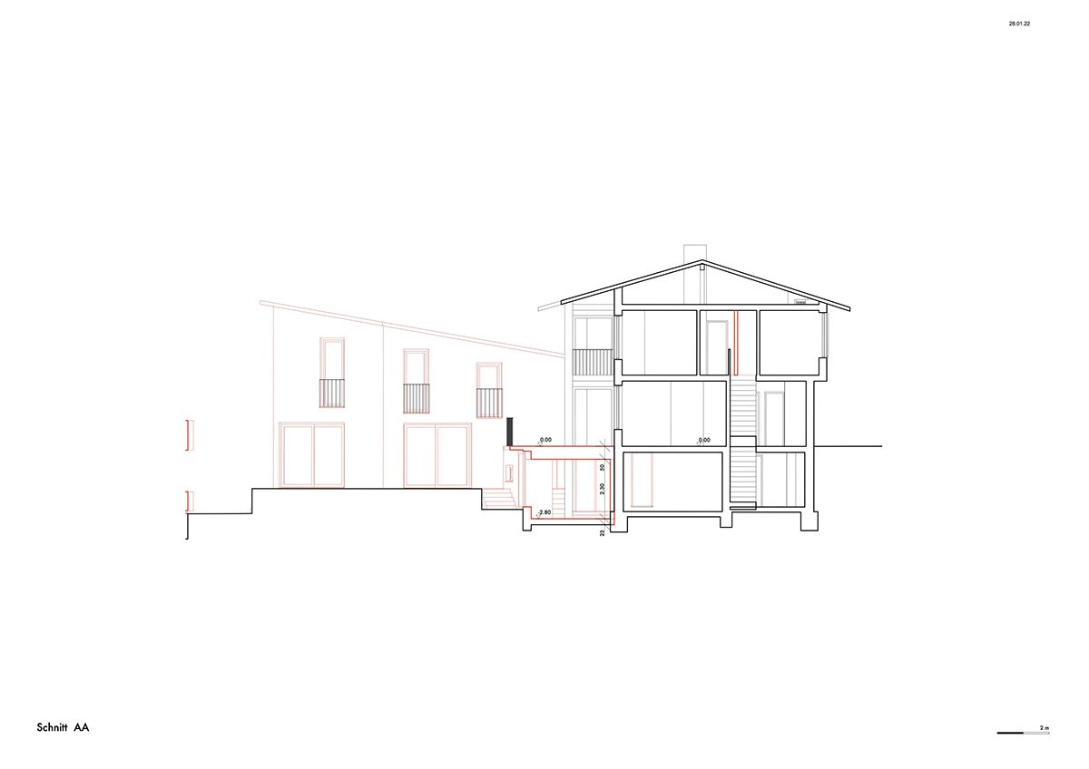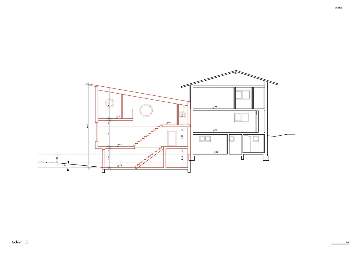 Der vorgeschlagene Erweiterungsbau windet sich nach oben und erzeugt unterschiedliche Raumhöhen innerhalb eines grosszügigen, offenen Wohnraums. Die Räume im Obergeschoss sind gestaffelt angeordnet, um maximale Belichtung und eine einfache, klare Nutzung zu ermöglichen.