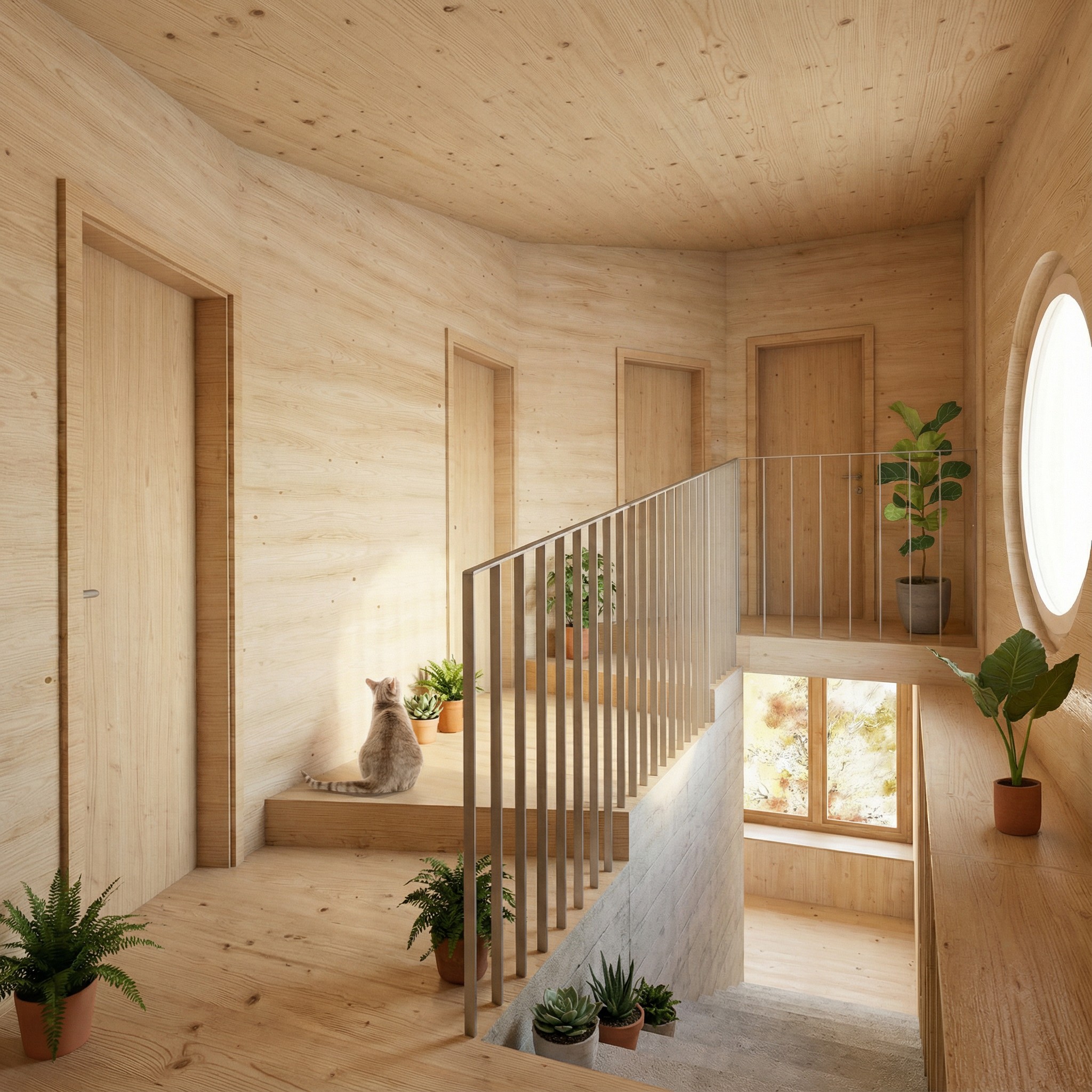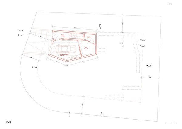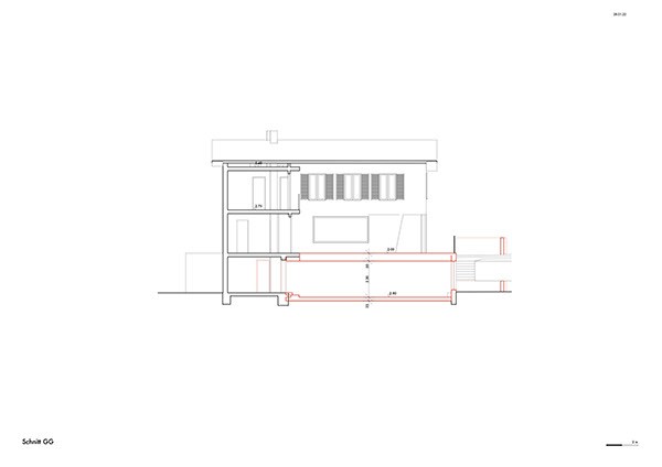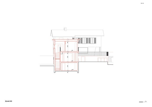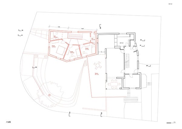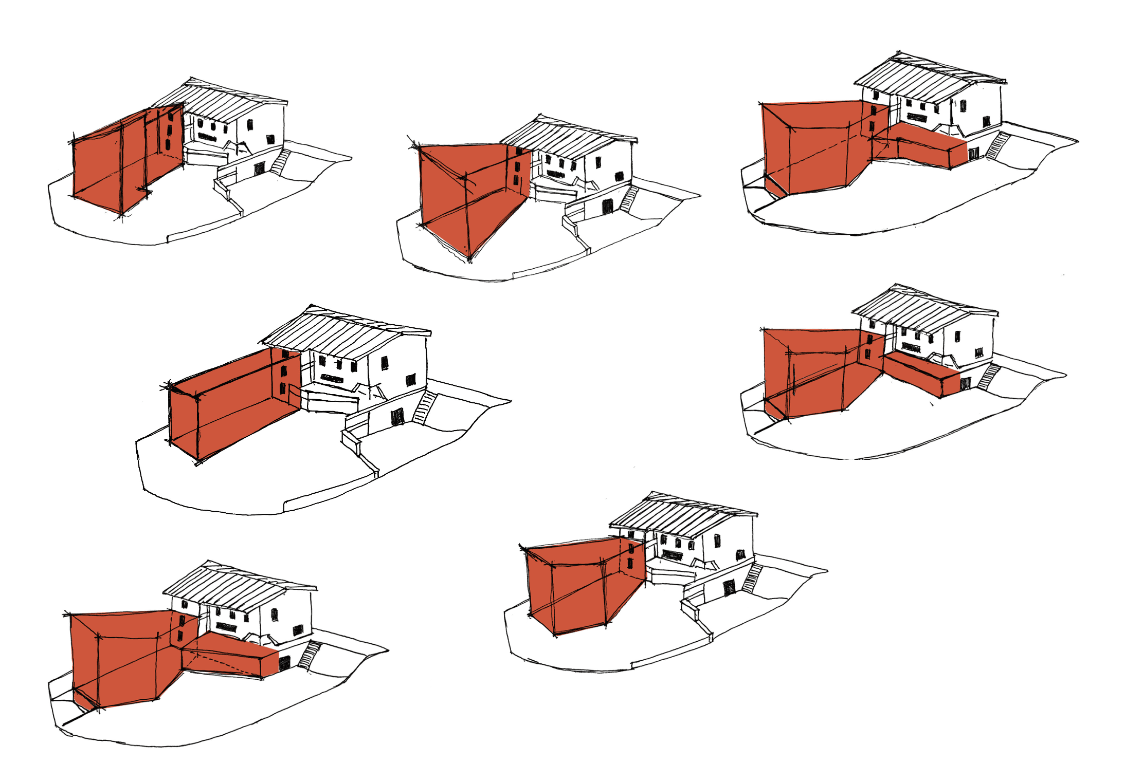 Der vorgeschlagene Erweiterungsbau windet sich nach oben und erzeugt unterschiedliche Raumhöhen innerhalb eines grosszügigen, offenen Wohnraums. Die Räume im Obergeschoss sind gestaffelt angeordnet, um maximale Belichtung und eine einfache, klare Nutzung zu ermöglichen.