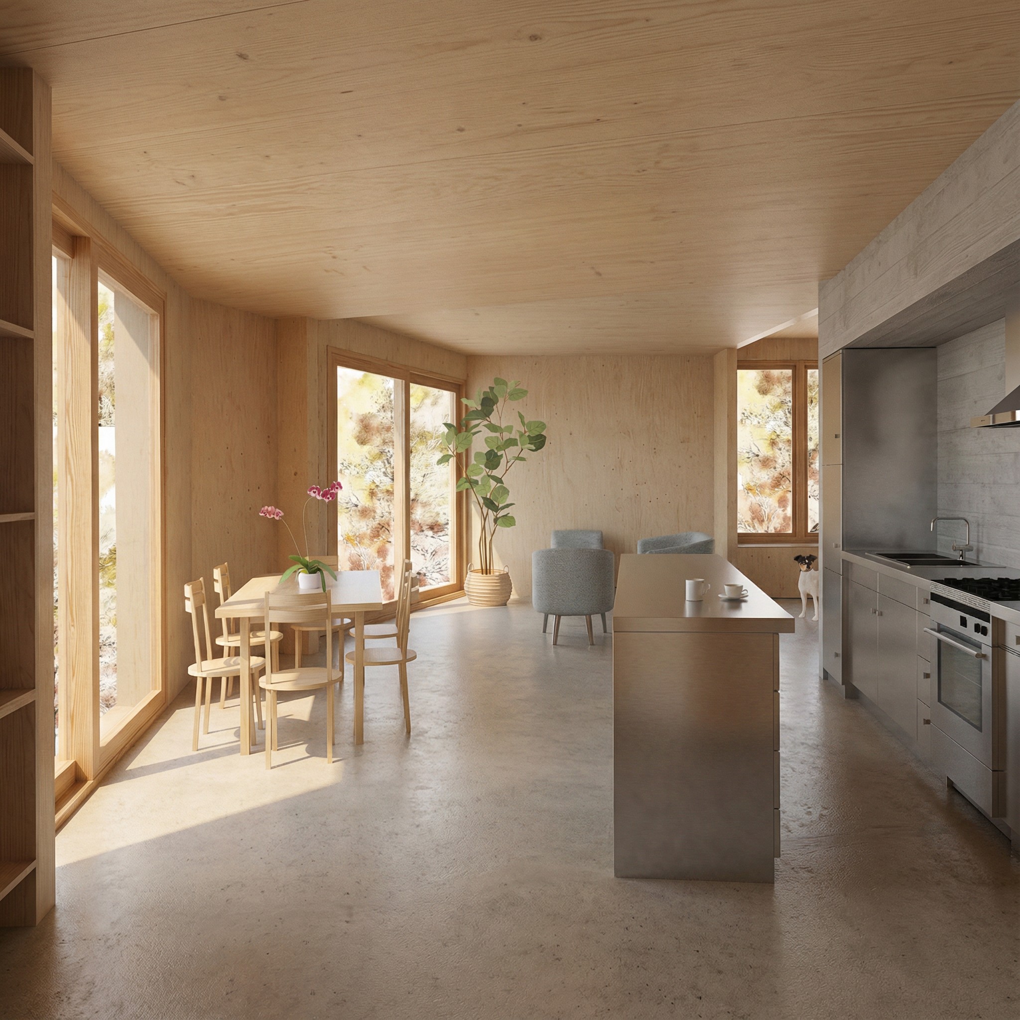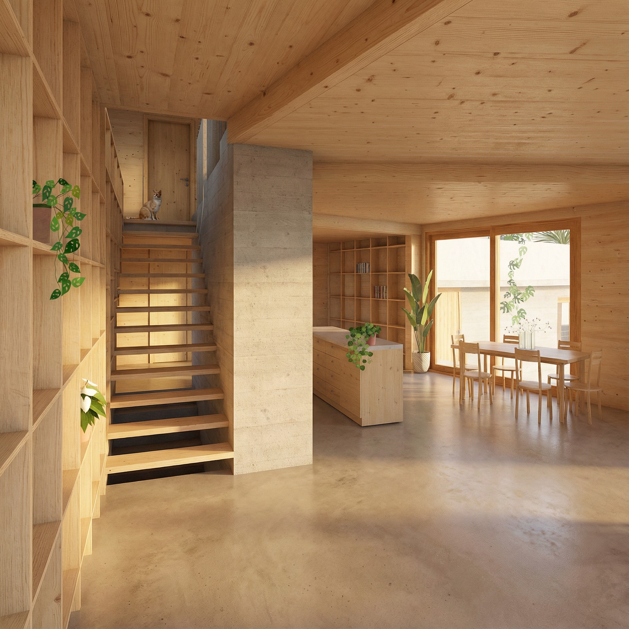 Eine tragende Holzkonstruktion um einen Betonkern definiert die räumliche Organisation und folgt einer durchgängigen konstruktiven Logik vom Untergeschoss bis zum Dach.