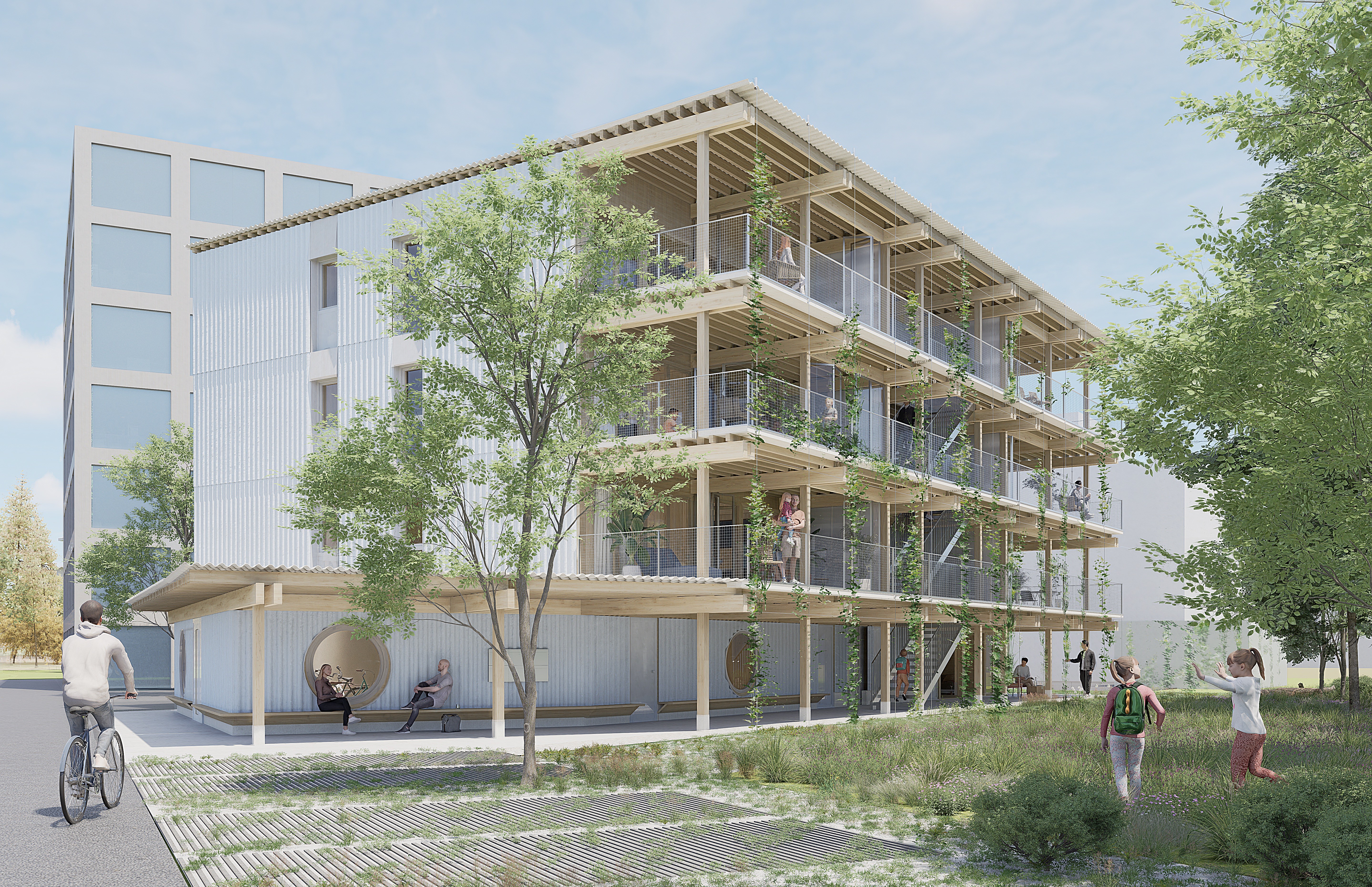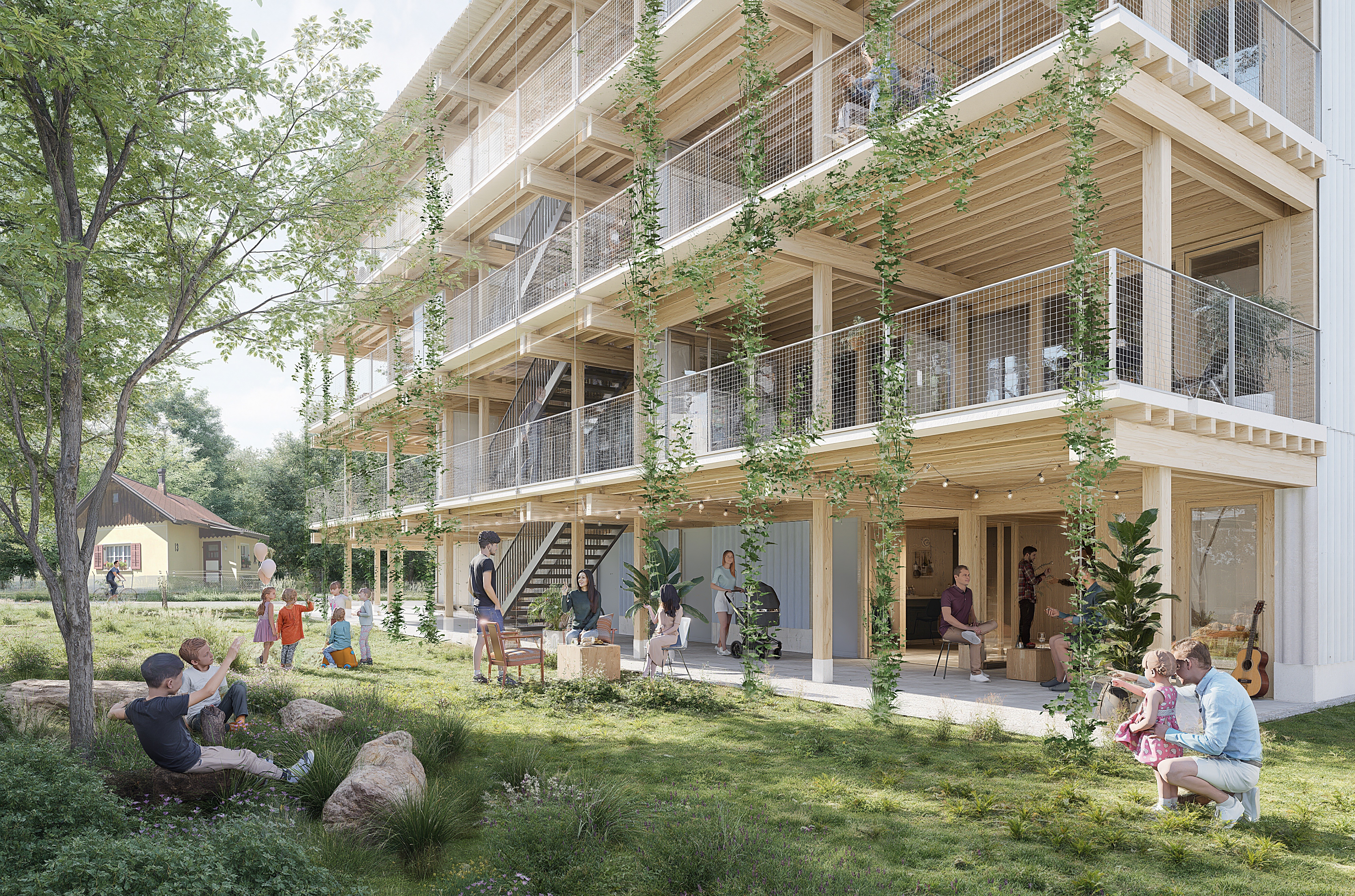 A communal ground floor, external circulation and a shared room support everyday neighbourly life. Timber construction, reused façade elements and a biodiverse outdoor space connect social and ecological sustainability in one compact structure.