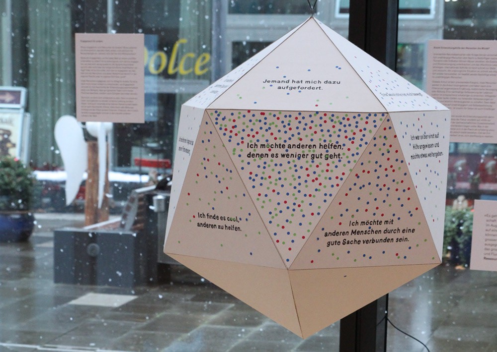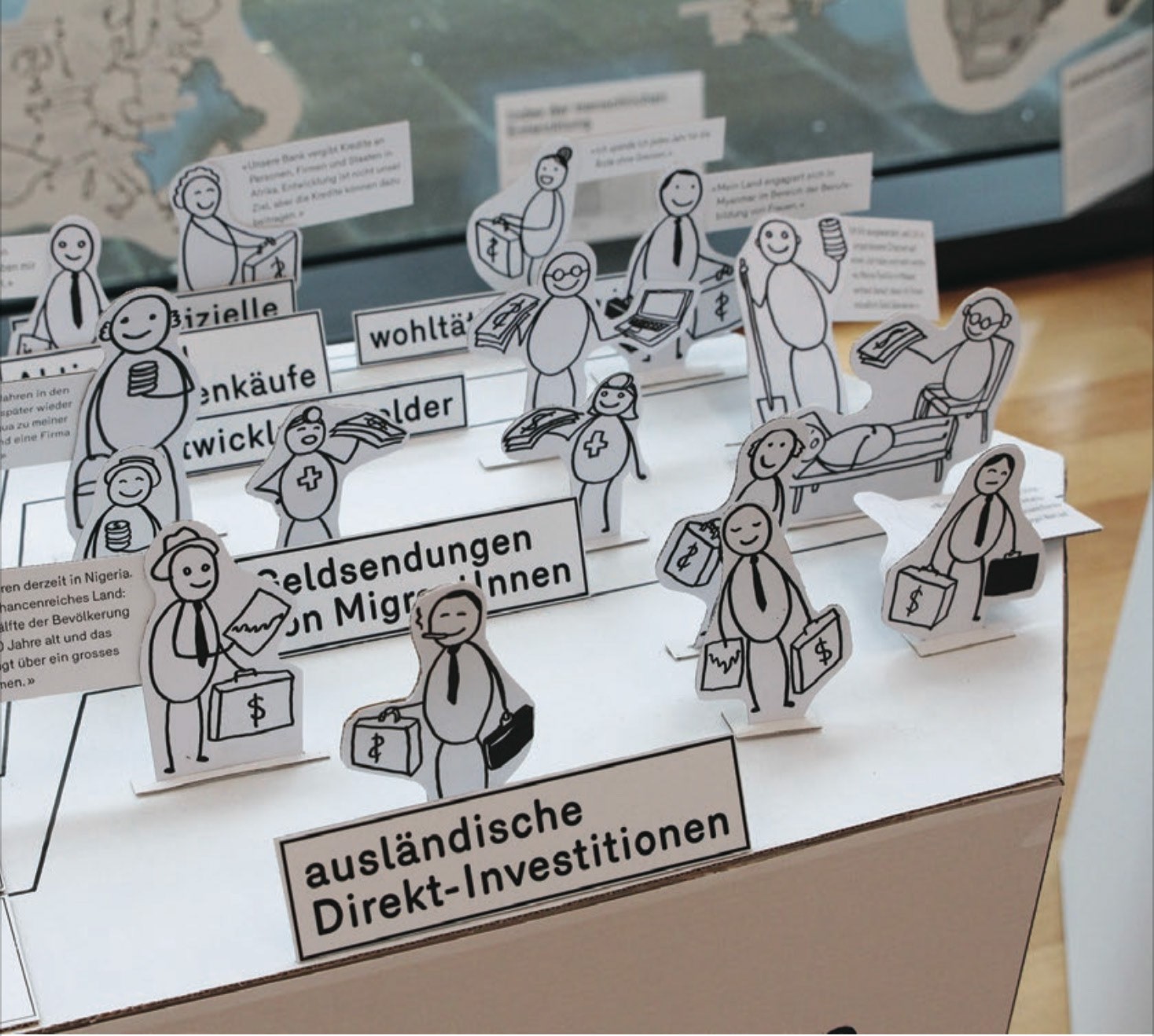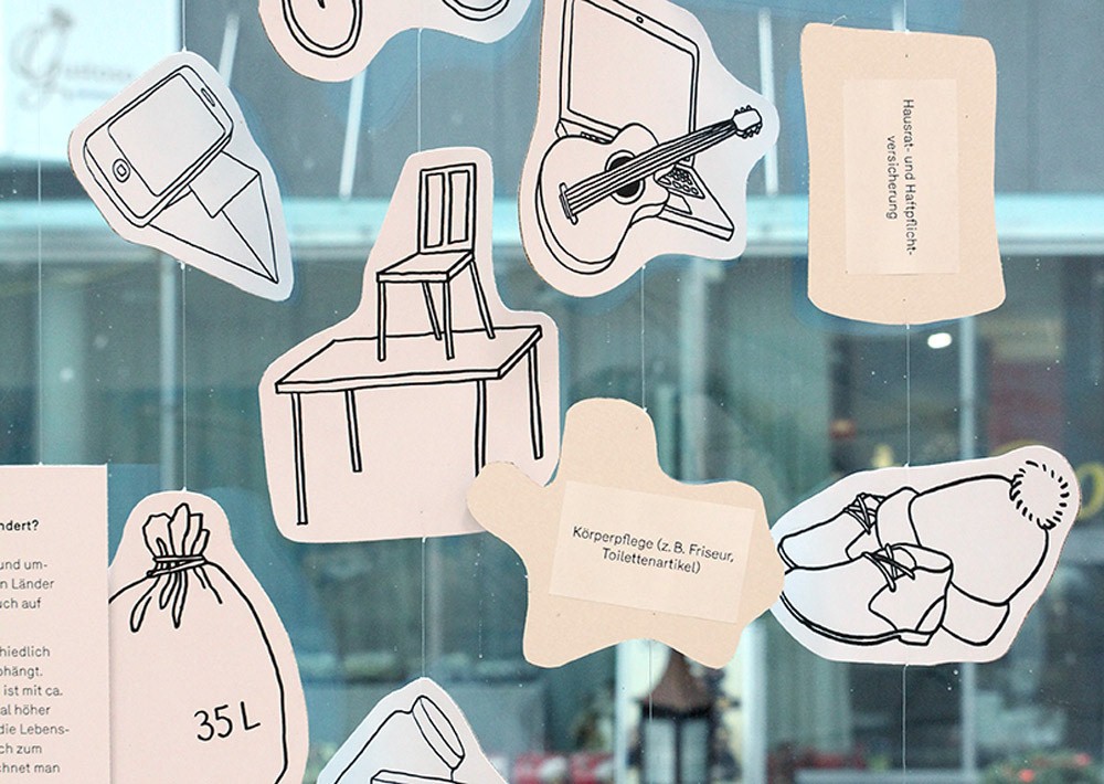 Die Ausstellung gliederte sich in sieben Themen: › Entwicklung: Was ist Entwicklung? Wer muss sich entwickeln, und wie? › Armut: Was bedeutet Armut? Wie hat sie sich im Laufe der Geschichte verändert? › Strategien: Welche Strategien zur Armutsbekämpfung wurden in den letzten Jahrzehnten eingesetzt? › Profitieren: Wer profitiert von wem? › Spenden: Soll jeder Cent direkt an die Bedürftigen gehen? › Engagement: Warum helfen Menschen anderen? › Würde: Wie kann Hilfe geleistet werden, ohne Abhängigkeiten zu schaffen?