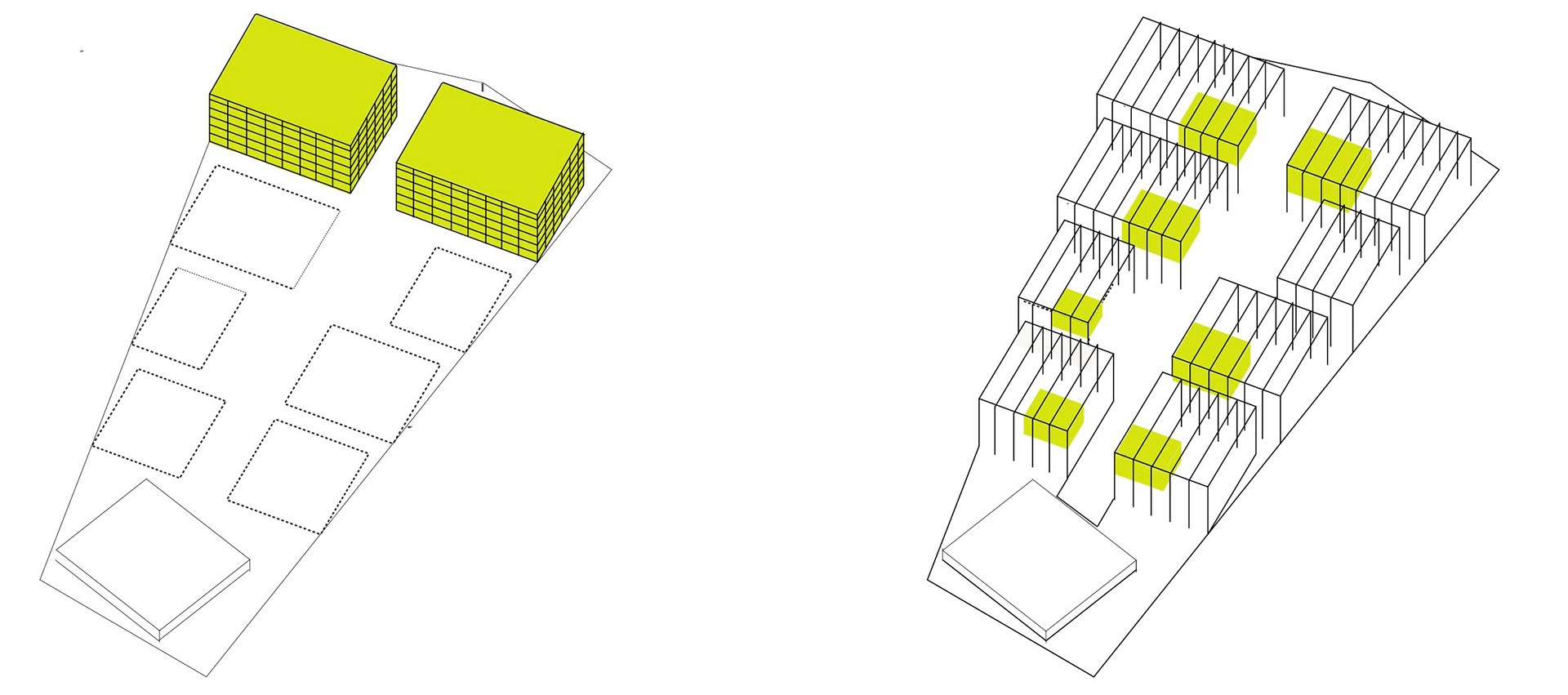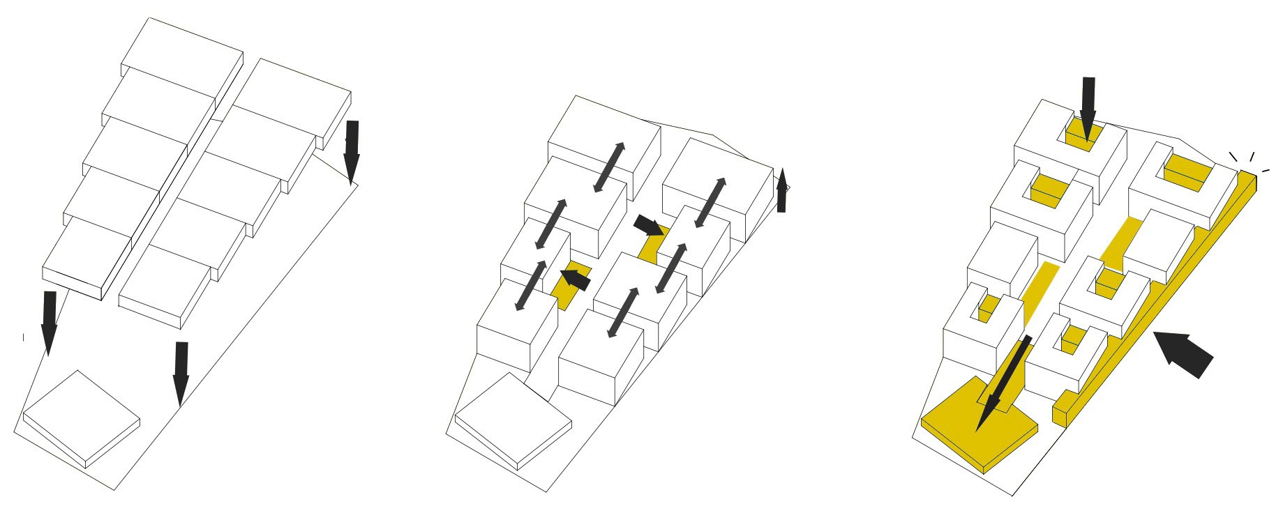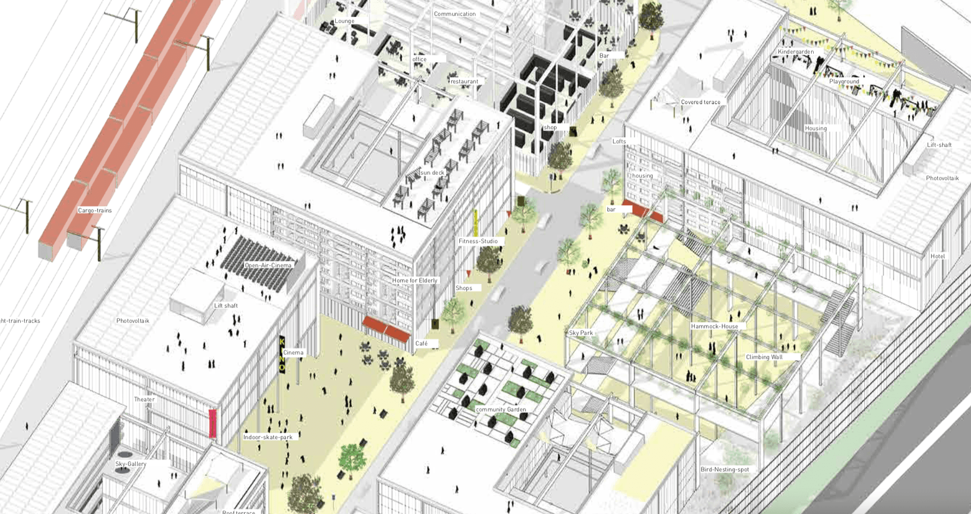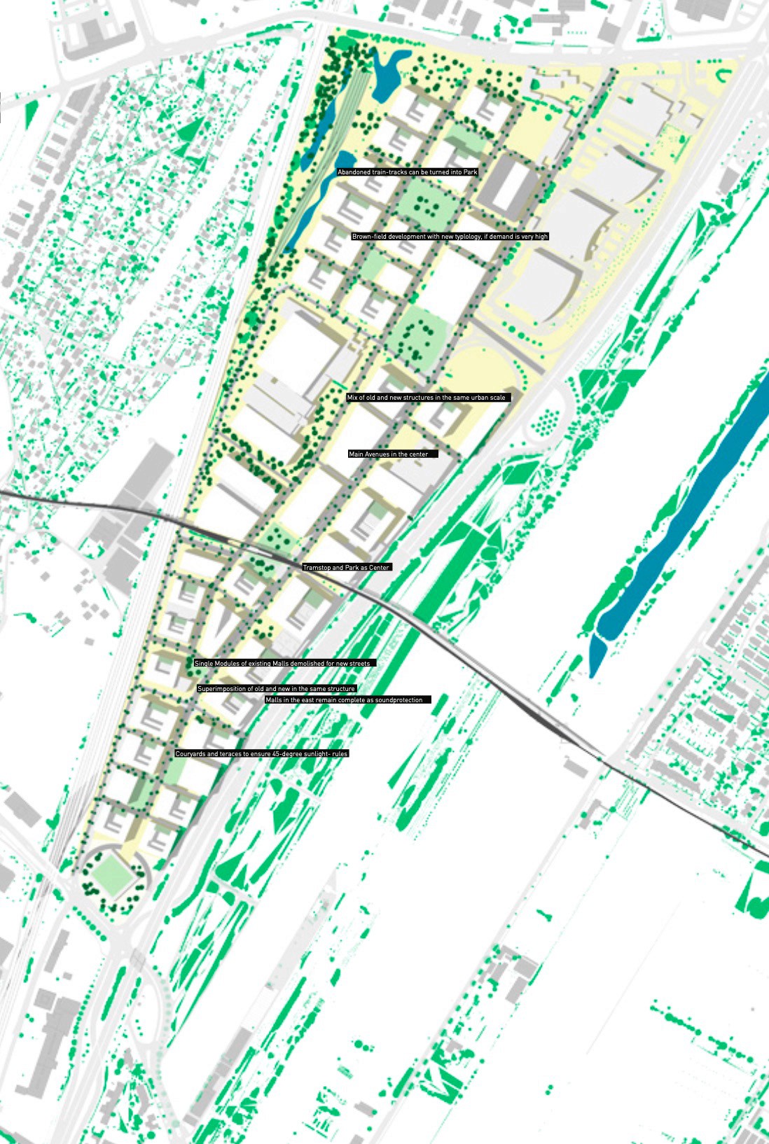 Eines der wenigen strukturellen Muster des heutigen Geländes ist eine Hauptstraße in der Mitte mit Nebenstraßen auf beiden Seiten. Öffentliche Plätze und Programme entlang dieser neuen Verkehrsader bilden das Rückgrat der Entwicklung.