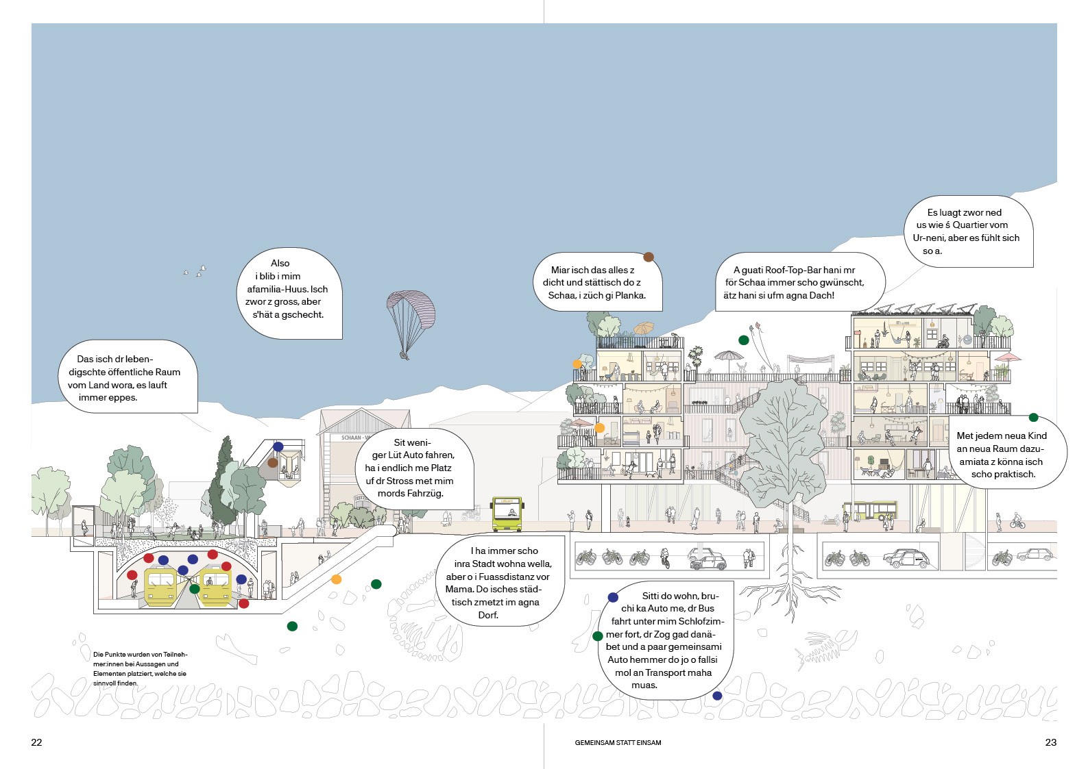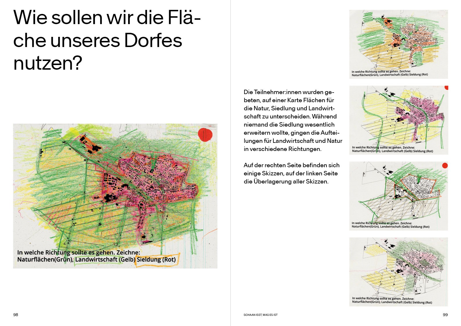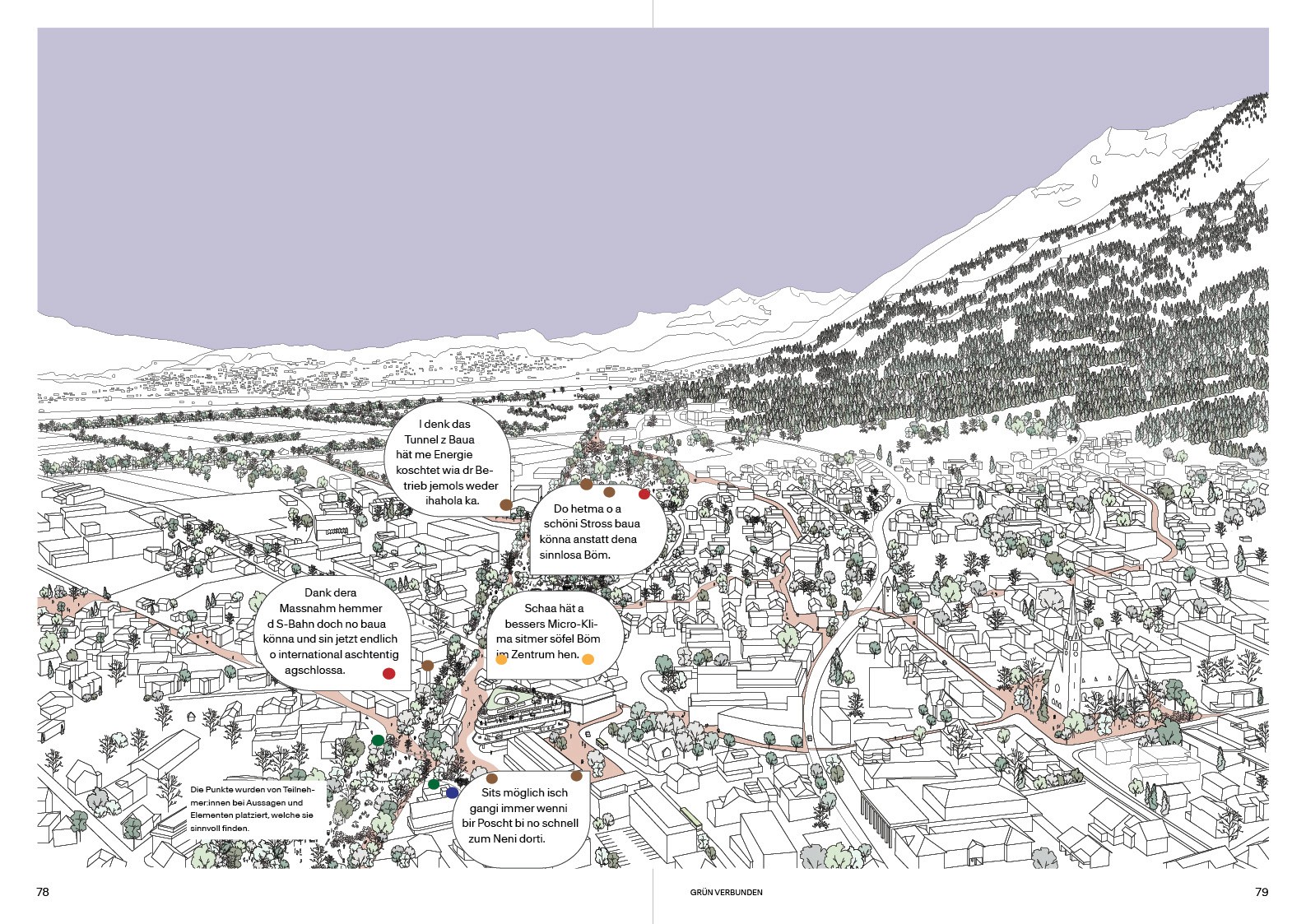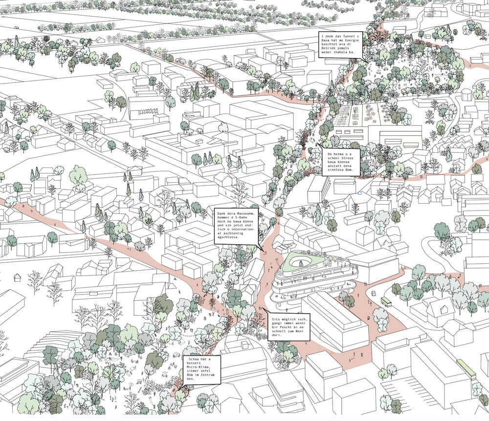 Zur Anregung der Diskussion entwickelten wir unterschiedliche Szenarien und übersetzten mögliche Zukünfte der Gemeinde in konkrete Bilder und räumliche Vorstellungen.